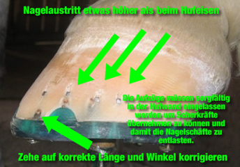 Die patentierten, verstellbaren Aufzüge („Clips“) übertragen Scherkräfte von außen an die Hufwand und entlasten damit die Nagelschäfte.